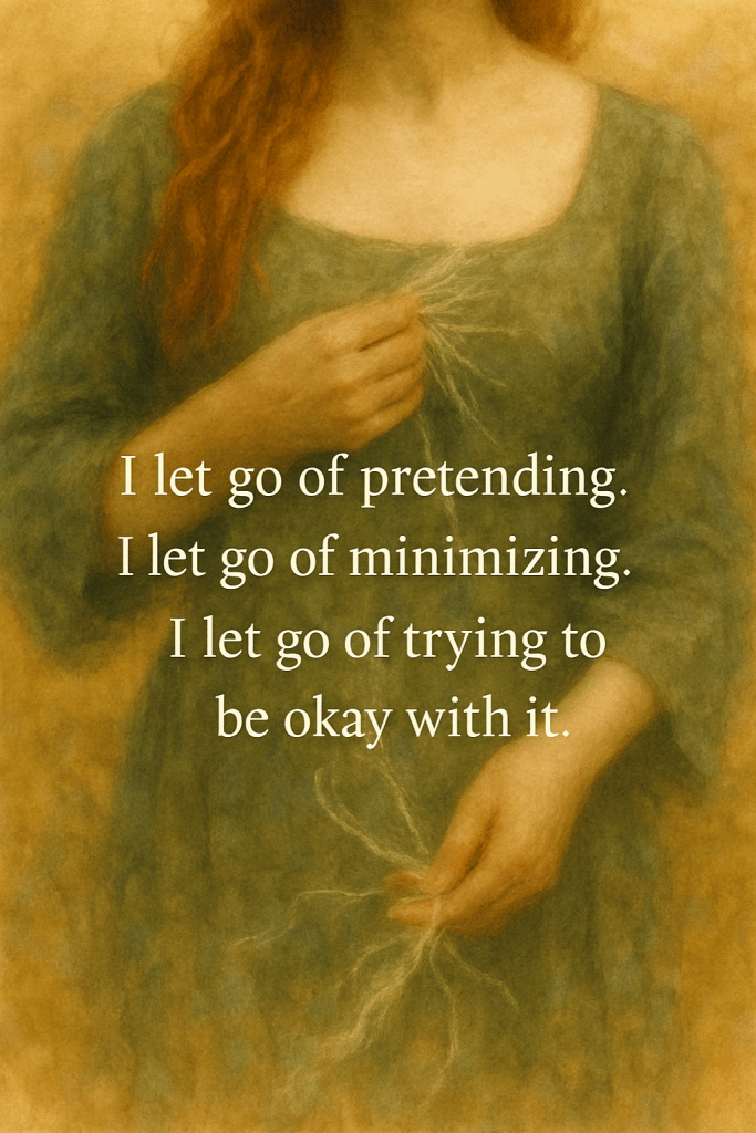 What is one truth I’ve been afraid to fully admit to myself? (Why did I feel I couldn’t face it before?) What have I been pretending I’m okay with—even though I’m not? What would it mean to believe myself without guilt or shame? What do I want to let go of—not in anger, but with tenderness? If I lay this down… what becomes possible?